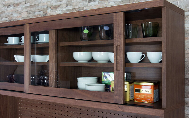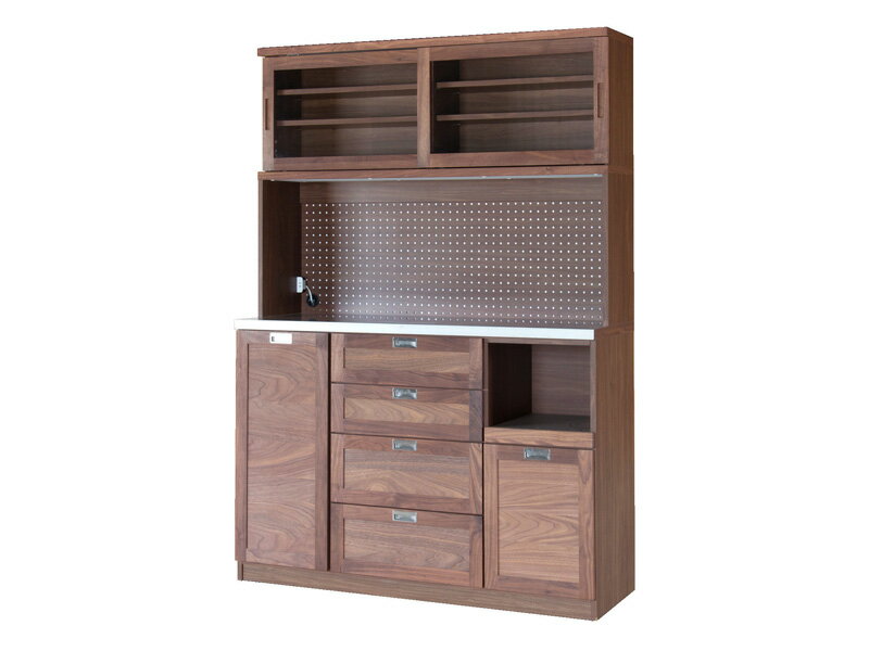食器棚 Fino フィーノ 幅140cm 高さ200cm カウンター高さ97cm キッチン 収納 引き戸 スライド扉 ガラス扉 可動棚板付き 引き出し スライドテーブル コンセント 木目 ステンレス クラスティーナ